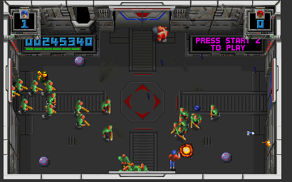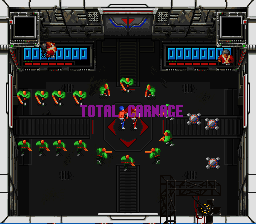 The Arcade Graveyard: Ghoulishly We Play Smash TV, Total Carnage Smash TV came out a long time ago, back when bloody violence was just a glimmer in the eye of gamers, and two years before the introduction of the Mortal Kombat series. It is also the evolution of the twin-stick shooter Robotron and is more familiar to us these days by any number of downloadable twin-stick shooters on any platform, from XBox 360 to PC to GameBoy. Sort of like the movie The Running Man, you're not a player, you're a "contestant!" You take on hoards of crazies in different rooms leading up to an epic boss battle while picking up cash and prizes on the way, all in an effort to stay alive, or to reach the fabled Pleasure Domes. A fun, mindless romp, and definitely a quarter-muncher, this is an arcade game that grows on you, and takes a poke at a cash money prizes society in a goofy way. And the announcer is awesome, points to what you would come to expect from the NBA Jam and NFL Blitz series. We love this shit! Smash TV was also available later on for the NES (awful version,) the Genesis (OK,) the SNES (almost perfect,) and on several other platforms like the original PlayStation, the Sega Genesis, the XBox, the PS2, the XBox 360, etc..