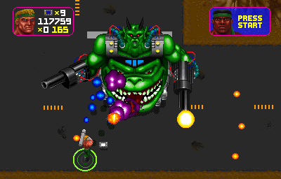 Super Smash TV on the Genesis. Cool thing on an emulator, you can map controls for Player #2's movement to the Player #1 controller, and in-game you can have Player #1 control movement and Player #2 control firing. Perfect arcade experience with controls! The odd thing, on Genesis it's called Super Smash TV, on the SNES it's called Smash TV. Aren't SNES games the ones with the word "Super" in them?